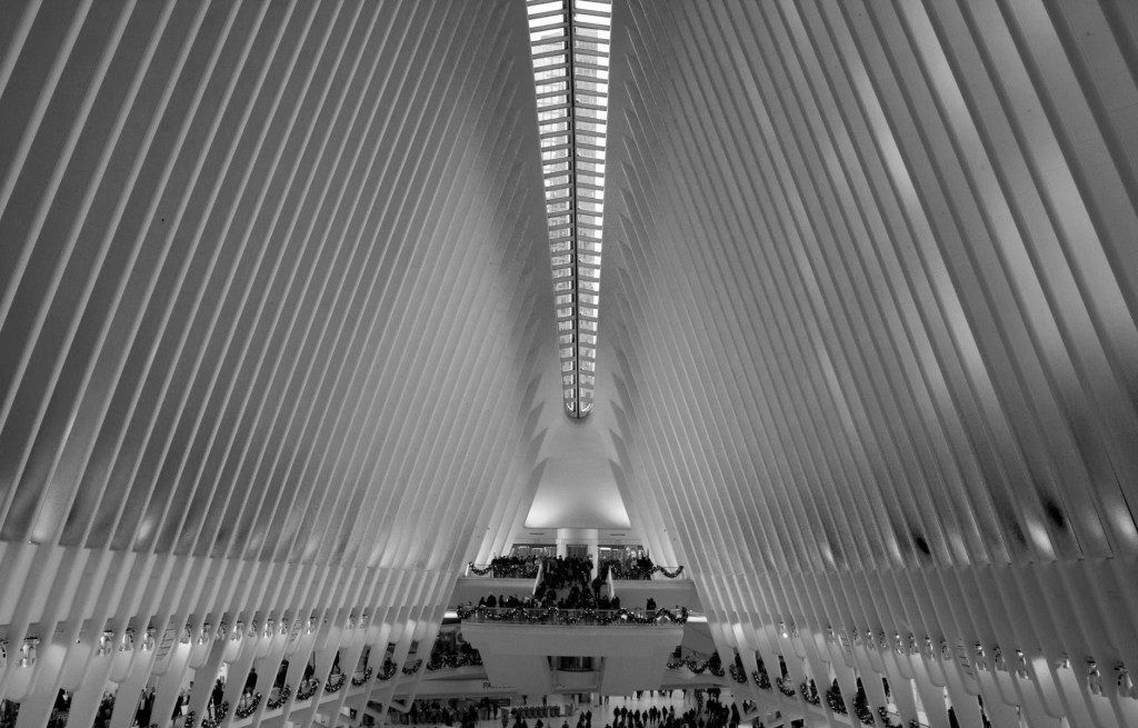 Como contrapunto a la tragedia, brota el espectro blanco de The Oculus, la estación y centro comercial, que anota el epílogo y nos indica que la vida sigue. Junto al 9/11 Museum verás una enorme estructura blanca que, según su diseñador, el arquitecto Santiago Calatrava, imita a un pájaro alzando el vuelo desde la mano de un niño. Es The Oculus, estación y centro comercial subterráneos. Una elegía a la confusión organizada, un punto abstracto de decadente contracultura hegemónica. Por un lado, está la central de transporte donde confluyen los metros de Nueva York y los trenes de cercanías de Nueva Jersey, y, por el otro, el Westfield Mall, un centro comercial de aspecto futurista repleto de tiendas y restaurantes. Emocionante visita de la que no saldrás en ningún momento indiferente.